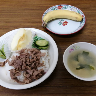 ◆献立:豚肉のしぐれ煮、ワカメと豆腐のみそ汁、キュウリの浅漬け、キウイフルーツ、リンゴ、バナナ